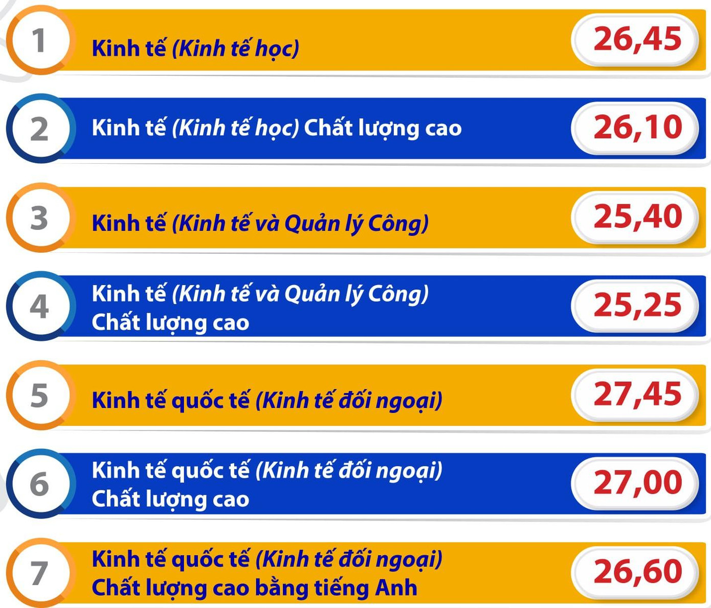 Theo thông tin từ Hội đồng tuyển sinh của trường, trung bình điểm trúng tuyển vào trường là 26,20 điểm, trong đó, điểm trung bình trúng tuyển khối ngành Kinh tế là 26,25 điểm, khối ngành Kinh doanh quản lý là 26,68 điểm và khối ngành Luật là 26,26 điểm. Đây là tổng điểm của 3 môn (không nhân hệ số) trong tổ hợp xét tuyển A00, A01, D01 và D07 đối với học sinh trung học phổ thông (THPT) khu vực 3. Điểm trúng tuyển cao nhất là 27,65 điểm đối với chương trình Kinh doanh quốc tế.