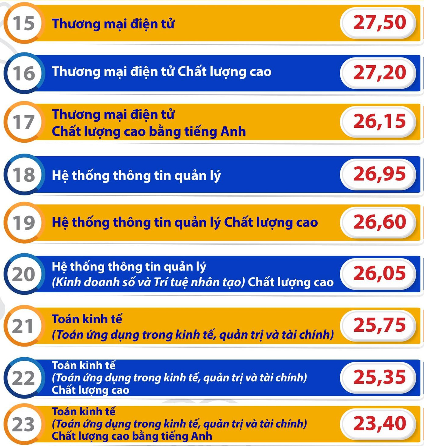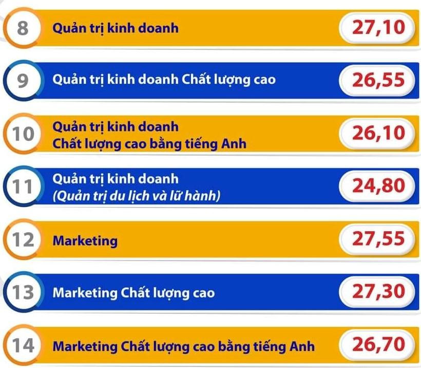 Ngoài ra, năm nay trường ĐH Kinh tế - Luật có 9 chương trình có điểm chuẩn từ 27,00 điểm trở lên gồm: Kinh doanh quốc tế: 27,65 điểm, Marketing: 27,55 điểm, Thương Mại điện tử: 27,50 điểm, Kinh tế quốc tế (Kinh tế đối ngoại): 27,45 điểm, Marketing chất lượng cao: 27,30 điểm, Thương mại điện tử (chất lượng cao): 27,20 điểm, Quản trị kinh doanh: 27,10, Kinh doanh quốc tế (Chất lượng cao): 27,05, Kinh tế quốc tế (Kinh tế đối ngoại) (Chất lượng cao): 27,00 điểm.