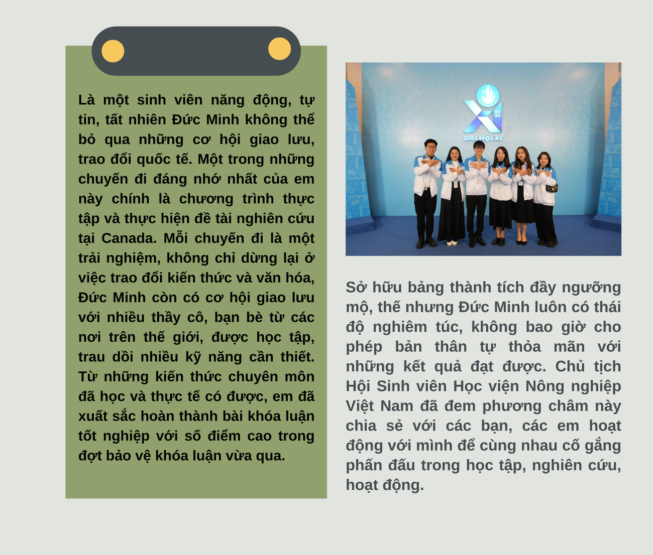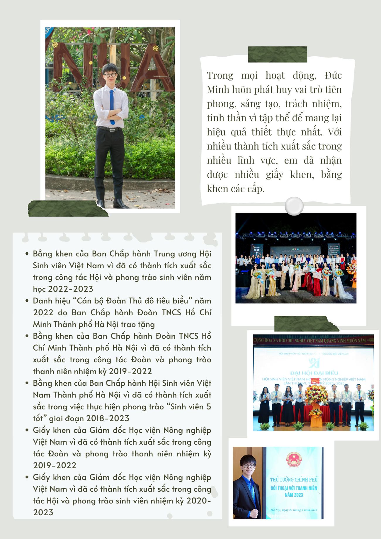 Trở thành thủ khoa đầu vào của Học viện Nông nghiệp Việt Nam, Đức Minh luôn xây dựng kế hoạch học tập rõ ràng và nỗ lực để chinh phục các mục tiêu đã đề ra. Chính vì vậy, trong suốt thời gian ngồi trên ghế giảng đường đại học, con đường học tập, nghiên cứu khoa học của Đức Minh luôn trải dài những thành tích đáng ghi nhận. Sở hữu điểm trung bình tích lũy đến nay đạt 3.73/4.00, giành giải Nhất Giải thưởng “Sinh viên nghiên cứu khoa học VNUA-2023”, giải Nhất Giải thưởng “Triển lãm Sinh viên nghiên cứu khoa học VNUA-2023”. Ngoài ra, Đức Minh cũng là tác giả của nhiều bài báo được đăng tải trên các tạp chí khoa học uy tín.