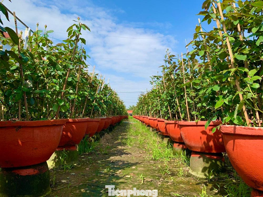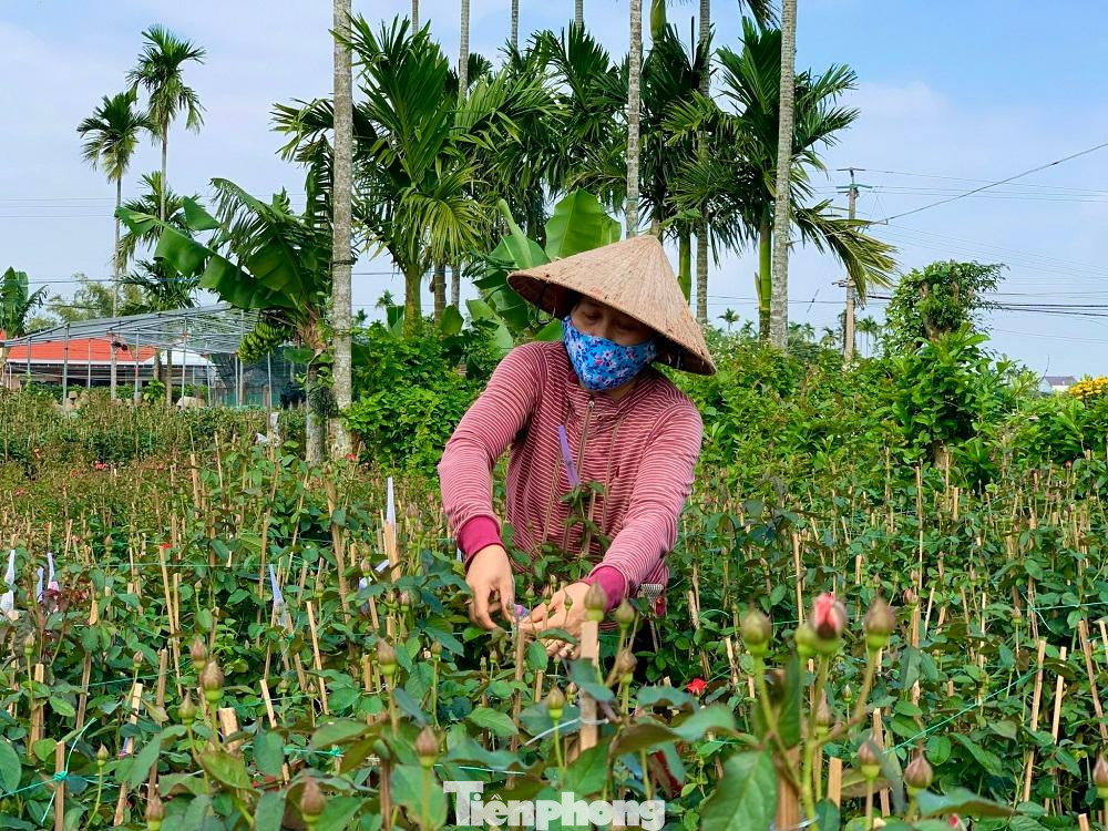 Tại vườn hồng của ông Trần Bá Triết (thôn Thế Bình, xã Nghĩa Hiệp), các nhân công đang tranh thủ bọc lưới cho hoa trước khi được mang đi tiêu thụ. Vườn hồng này có hơn 1.000 chậu với đa dạng các loại hồng như tỷ muội, nhung Đức, nhung Mỹ... cũng đã được thương lái đặt mua, giá bán bình quân 350- 400 ngàn đồng/chậu.