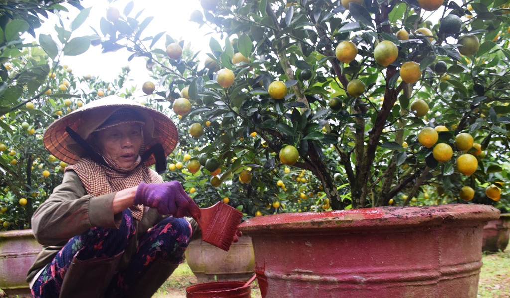 Những ngày này, không khí ở làng quất Cẩm Hà rộn ràng, tất bật với những công đoạn như cắt tỉa lá, cành hư, đưa chậu về vườn, quét sơn và đưa quất vào chậu chuẩn bị bán ra thị trường. Dù mệt nhưng ai cũng vui tươi phấn khởi bởi bỏ công chăm bón vất vả một năm nay chuẩn bị đón thành quả.