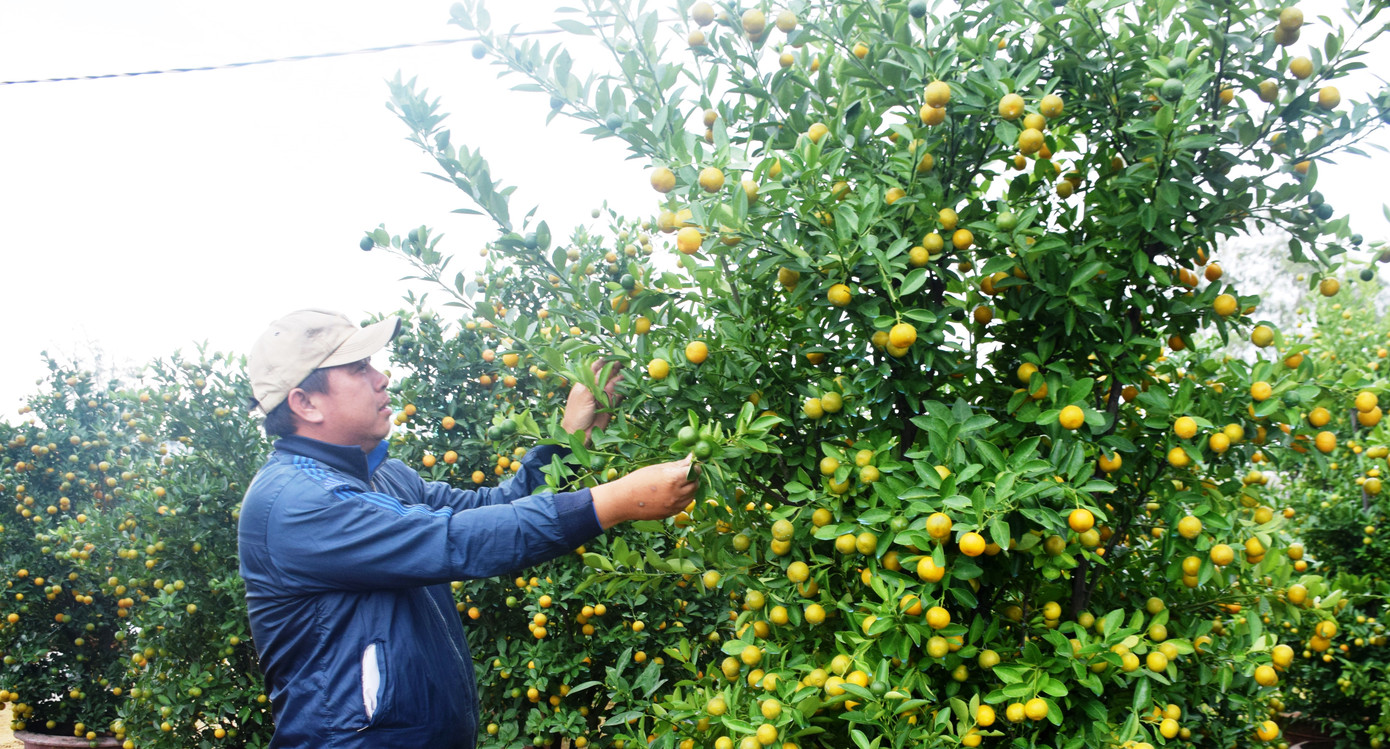 Vườn quất của gia đình ông Nguyễn Phúc (40 tuổi, thôn Bàu Ốc Hạ, xã Cẩm Hạ) trồng hơn 500 chậu để xuất bán dịp Tết. Những cây quất sai quả đang được ông và các thành viên trong gia đình tỉa lá, đưa vào chậu để sắp tới đưa ra thị trường phục vụ Tết.