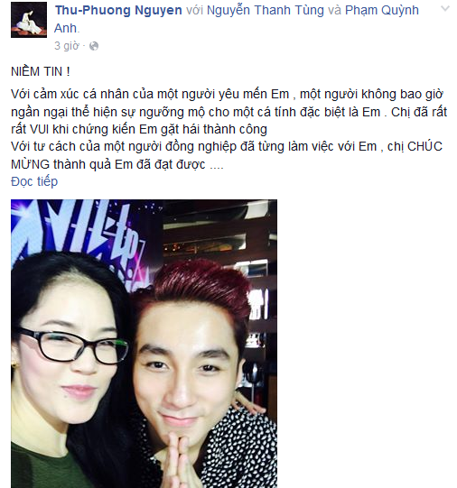 Ngoài tình yêu mến dành cho ca sĩ trẻ gốc Thái Bình, Thu Phương không ngần ngại bày tỏ sự ngưỡng mộ với đàn em. “Với cảm xúc cá nhân của một người yêu mến em, một người không bao giờ ngần ngại thể hiện sự ngưỡng mộ cho một cá tính đặc biệt là em”- Thu Phương viết.