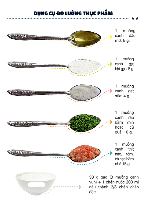 Nếu trong nhà không có sẵn các dụng cụ cân đo chính xác, bạn có thể ước lượng thực phẩm bằng muỗng canh theo cách tính 1 muỗng canh dầu, bột gạo = 5 g...