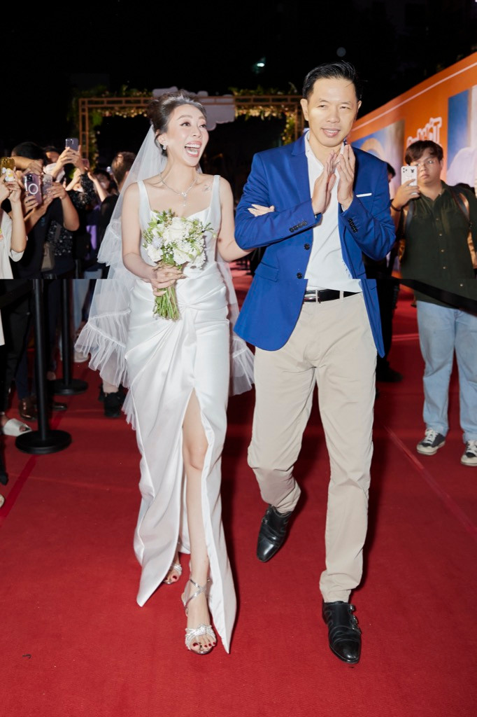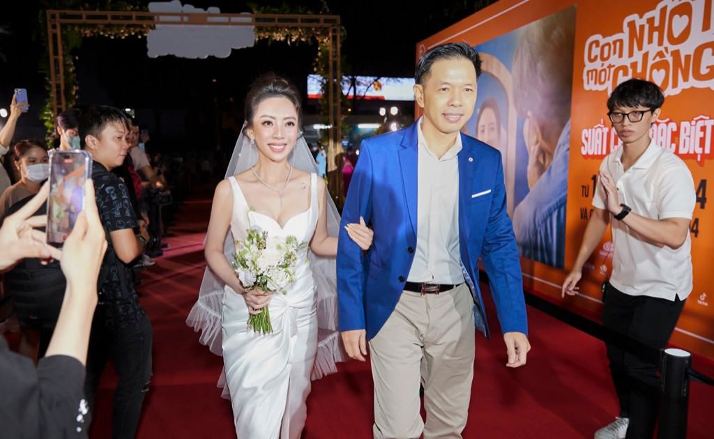 Thảm đỏ Con Nhót Mót Chồng được mô phỏng như một lễ đường với sự xuất hiện bất ngờ của “cô dâu” Thu Trang trong chiếc áo cưới trắng. Đặc biệt, Thái Hòa chính là người khoác tay "con gái màn ảnh" của mình tiến vào thảm đỏ.