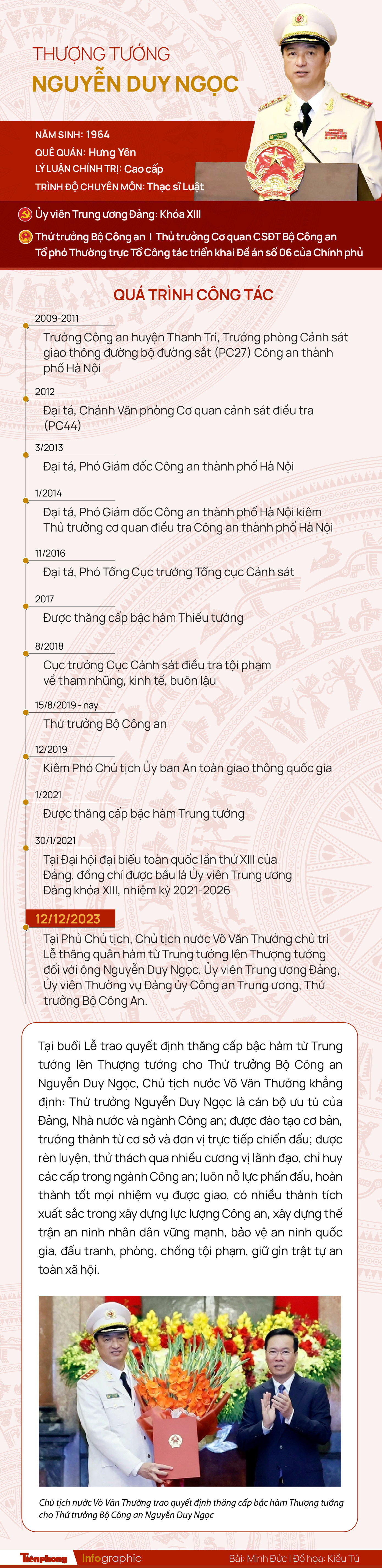 Chủ tịch nước khẳng định, Thứ trưởng Nguyễn Duy Ngọc là cán bộ ưu tú của Đảng, Nhà nước và ngành công an; được đào tạo cơ bản, trưởng thành từ cơ sở và đơn vị trực tiếp chiến đấu; được rèn luyện, thử thách qua nhiều cương vị lãnh đạo, chỉ huy các cấp trong ngành công an; luôn nỗ lực phấn đấu, hoàn thành tốt mọi nhiệm vụ được giao, có nhiều thành tích xuất sắc trong xây dựng lực lượng công an, xây dựng thế trận an ninh nhân dân vững mạnh, bảo vệ an ninh quốc gia, đấu tranh, phòng, chống tội phạm, giữ gìn trật tự an toàn xã hội. Dù trong bất kỳ điều kiện, hoàn cảnh nào, đồng chí Nguyễn Duy Ngọc luôn kiên định, tuyệt đối trung thành với Đảng, Tổ quốc và nhân dân; giữ vững bản lĩnh, phẩm chất đạo đức cách mạng của người đảng viên, người cán bộ công an nhân dân; xứng đáng với sự tin cậy của Đảng, Nhà nước và nhân dân...