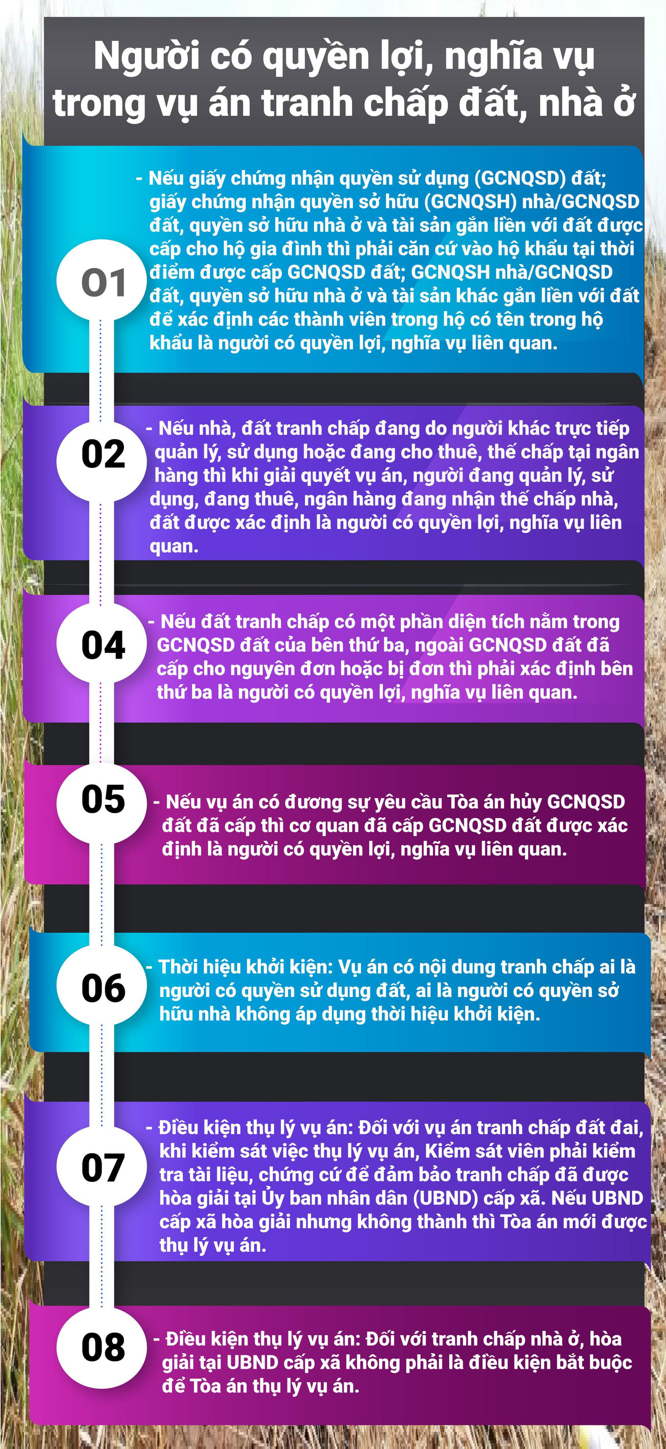 TPO - Theo Hướng dẫn 32/HD-VKSTC, khi giải quyết các trường hợp tranh chấp quyền sử dụng đất (QSDĐ), tranh chấp quyền sở hữu nhà hoặc quyền sở hữu nhà gắn liền với QSDĐ, cần phải lưu ý một số nội dung mới.
