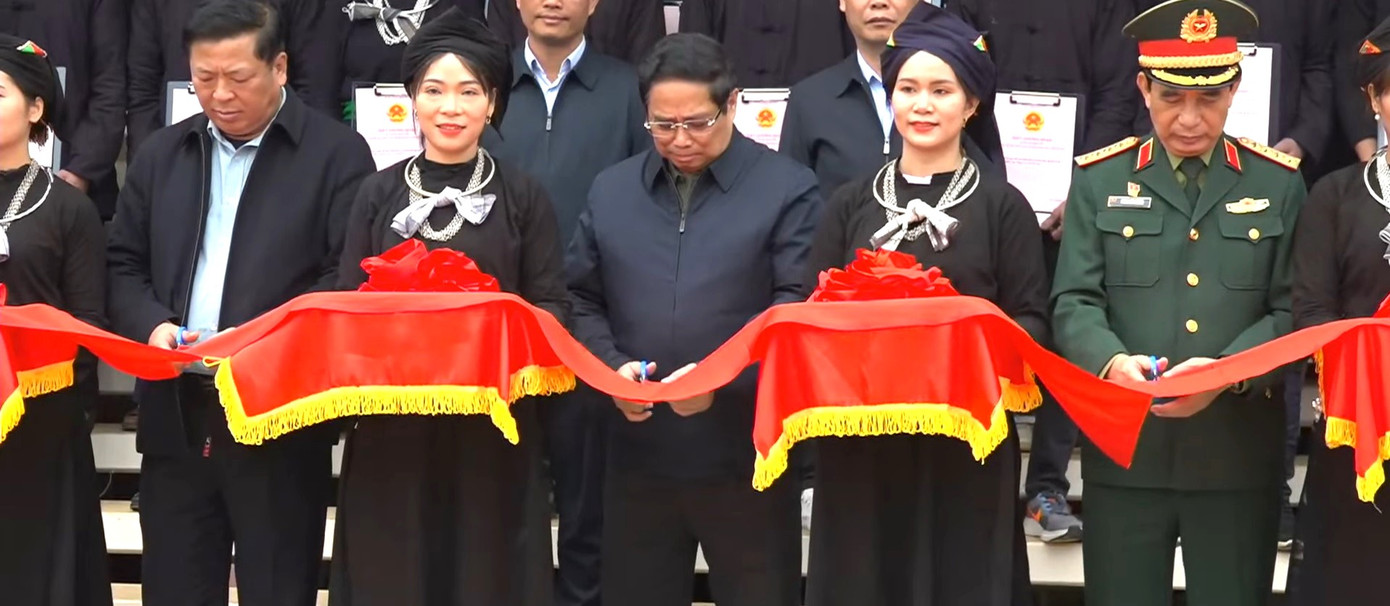| Cuối buổi lễ, Thủ tướng Phạm Minh Chính, cùng các vị đại biểu cắt băng khánh thành khu tái định cư Làng Nủ, Nậm Tông, Kho Vàng. |