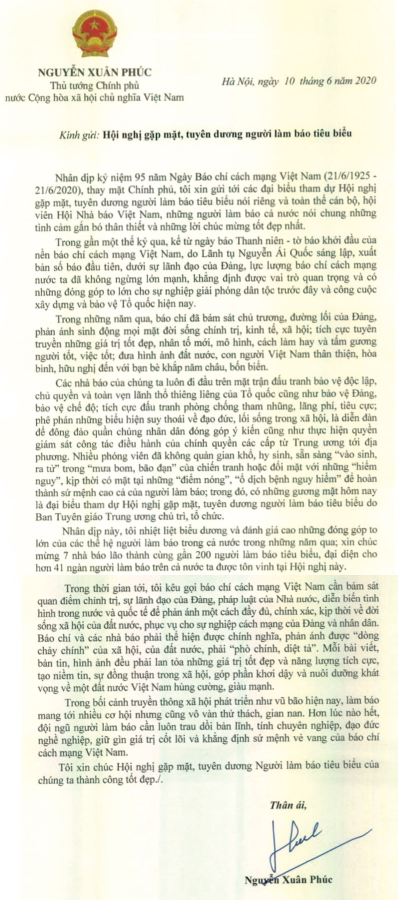 Nhân dịp kỷ niệm 95 năm Ngày Báo chí cách mạng Việt Nam, Thủ tướng Chính phủ Nguyễn Xuân Phúc có thư gửi tới các đại biểu tham dự Hội nghị gặp mặt, tuyên dương người làm báo tiêu biểu nói riêng và toàn thể cán bộ, hội viên Hội Nhà báo Việt Nam, những người làm báo cả nước nói chung những tình cảm gắn bó thân thiết và những lời chúc mừng tốt đẹp nhất.