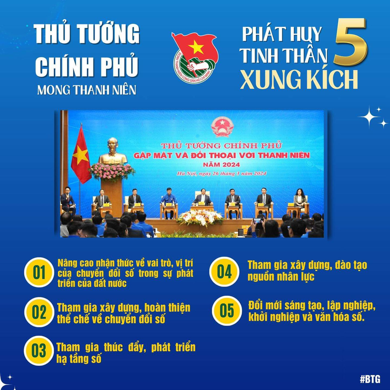SVO - Chia sẻ với thanh niên cả nước trong buổi đối thoại sáng 26/3, Thủ tướng Phạm Minh Chính nhấn mạnh: Đảng, Nhà nước luôn tin tưởng, hy vọng và mong muốn Đoàn và thanh niên khẳng định vị trí, vai trò, sứ mệnh lịch sử trong mọi hoạt động và nhắn gửi thanh niên Việt Nam tiếp tục phát huy tinh thần '5 xung kích' và '6 khát vọng'.