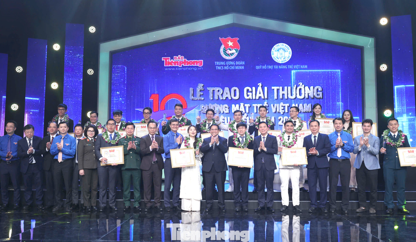 | Thủ tướng Chính phủ Phạm Minh Chính và Bí thư thứ nhất Trung ương Đoàn Bùi Quang Huy tặng thưởng 10 Gương mặt trẻ Việt Nam tiêu biểu năm 2024. |
