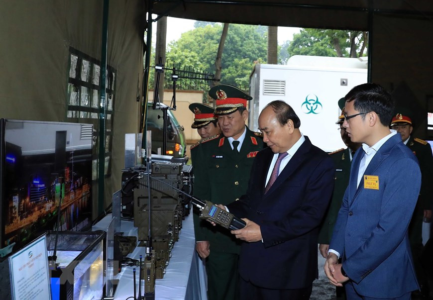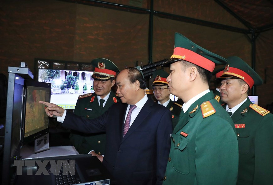 Thủ tướng Nguyễn Xuân Phúc và các đại biểu xem trưng bày các thiết bị quân sự công nghệ cao. (Ảnh: Thống Nhất/TTXVN).