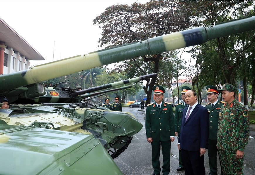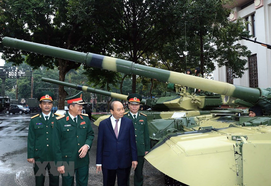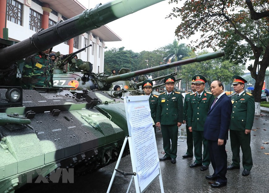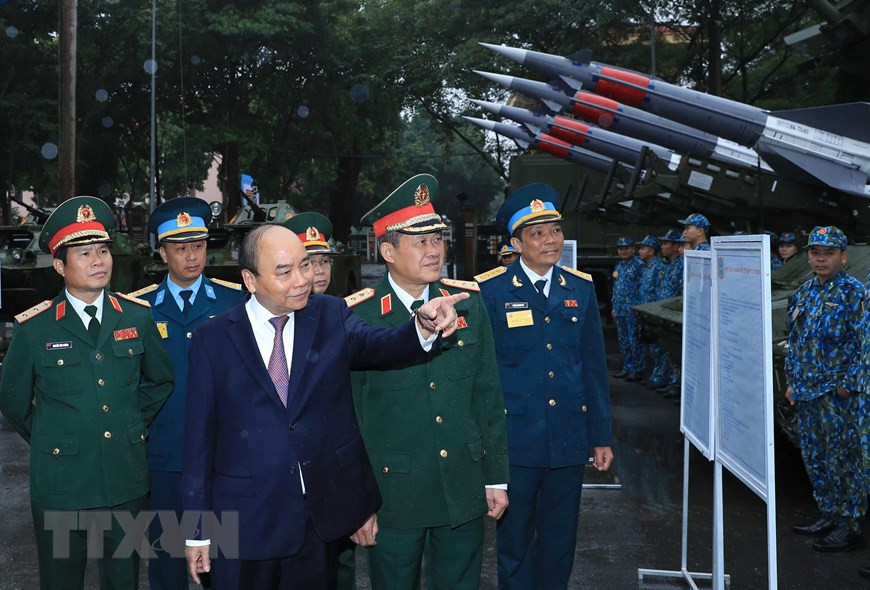 Thủ tướng Nguyễn Xuân Phúc và các đại biểu xem trưng bày vũ khí và khí tài. (Ảnh: Thống Nhất/TTXVN).