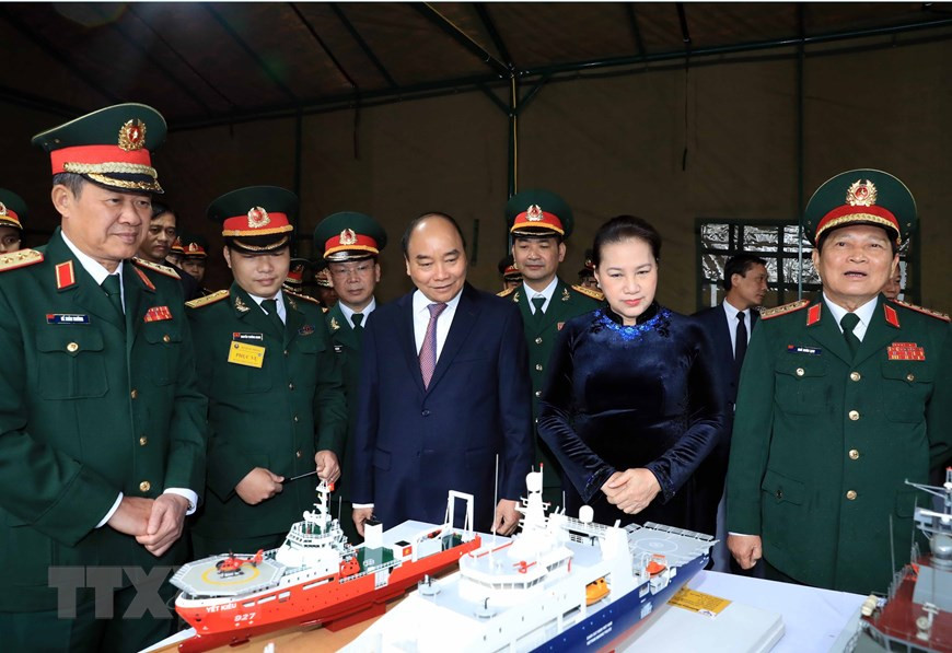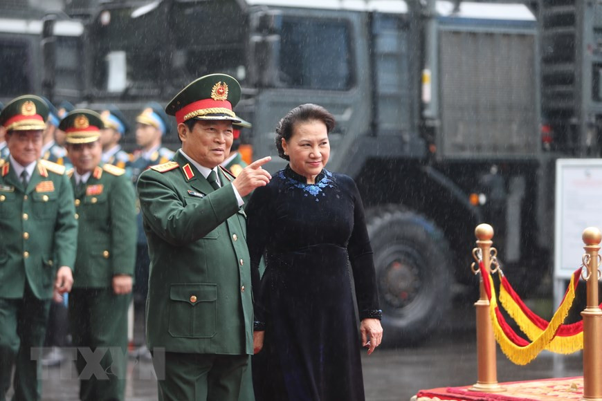 Thủ tướng Nguyễn Xuân Phúc, Chủ tịch Quốc hội Nguyễn Thị Kim Ngân và các đại biểu xem trưng bày vũ khí và khí tài. (Ảnh: Thống Nhất/TTXVN).