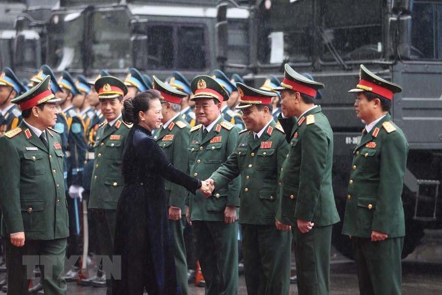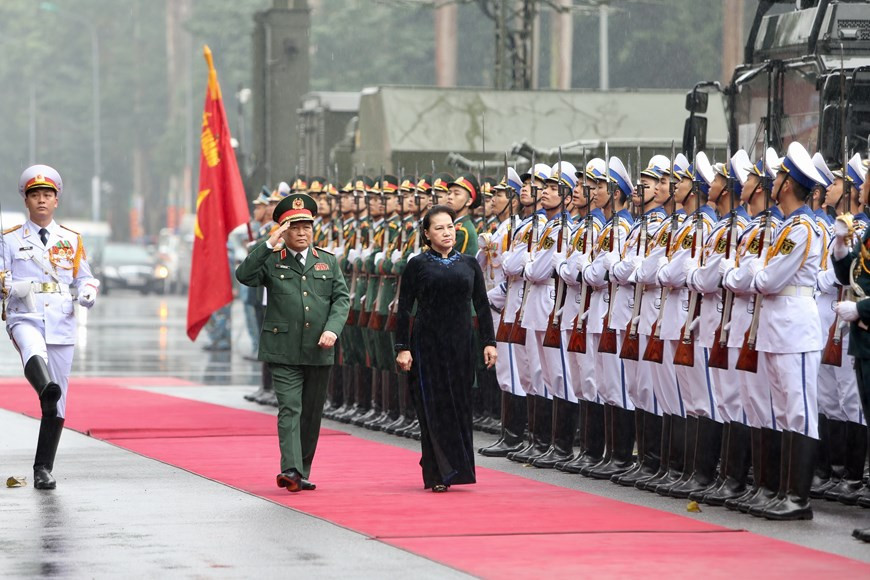 Chủ tịch Quốc hội Nguyễn Thị Kim Ngân duyệt đội danh dự Quân đội Nhân dân Việt Nam. (Ảnh: Dương Giang/TTXVN).