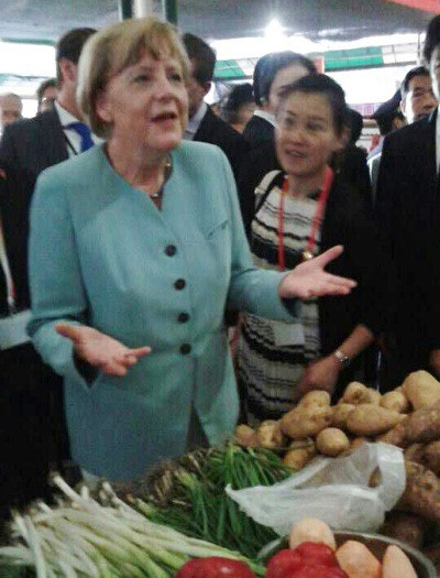 Sau đó, nữ Thủ tướng Đức đến thăm một khu chợ truyền thống ở thành phố này. Tại đây, bà mua một hũ đậu tương giá 5 nhân dân tệ (0,8 USD). Ảnh: Chinadaily