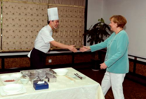 Bà Merkel bắt tay tạm biệt một đầu bếp. Theo kế hoạch, Thủ tướng Đức sẽ hội đàm với Chủ tịch Tập Cận Bình và Thủ tướng Lý Khắc Cường trong chuyến thăm Trung Quốc lần thứ 7 kể từ năm 2005. Ảnh: Reuters