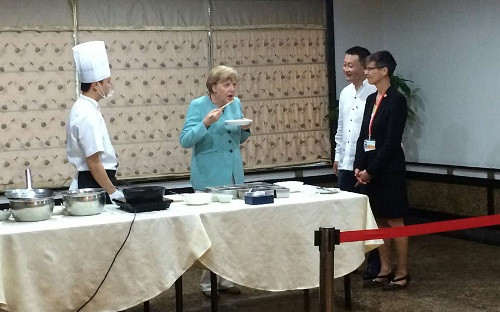 Thủ tướng Đức nếm thử món ăn, sau đó trò chuyện với đầu bếp và các nhân viên của nhà hàng. Ảnh: Chinadaily