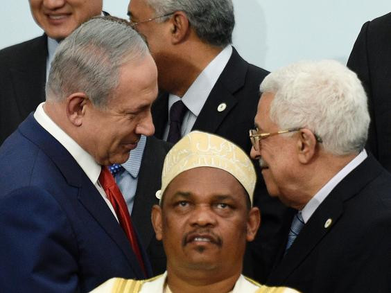 Thủ tướng Israel Benjamin Netanyahu (trái) trò chuyện cùng Tổng thống Palestine Mahmud Abbas phía sau khuôn mặt hài hước của Tổng thống Liên bang Comoros, ông Ikililou Dhoinine bên lề hội nghị bến đổi khí hậu ở Paris