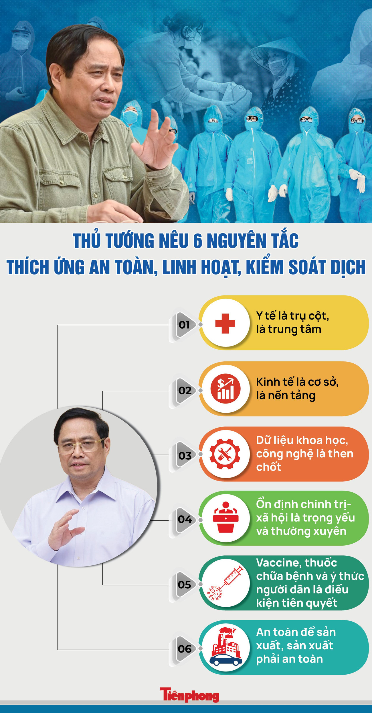 TPO - Thủ tướng Chính phủ Phạm Minh Chính, Trưởng Ban Chỉ đạo Quốc gia phòng, chống dịch COVID-19 nhấn mạnh 6 nguyên tắc phải quán triệt để xây dựng hướng dẫn thích ứng an toàn, linh hoạt, kiểm soát có hiệu quả dịch bệnh COVID-19.