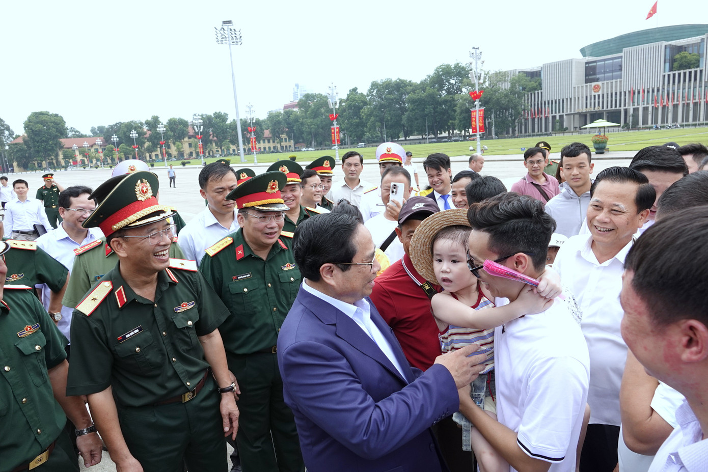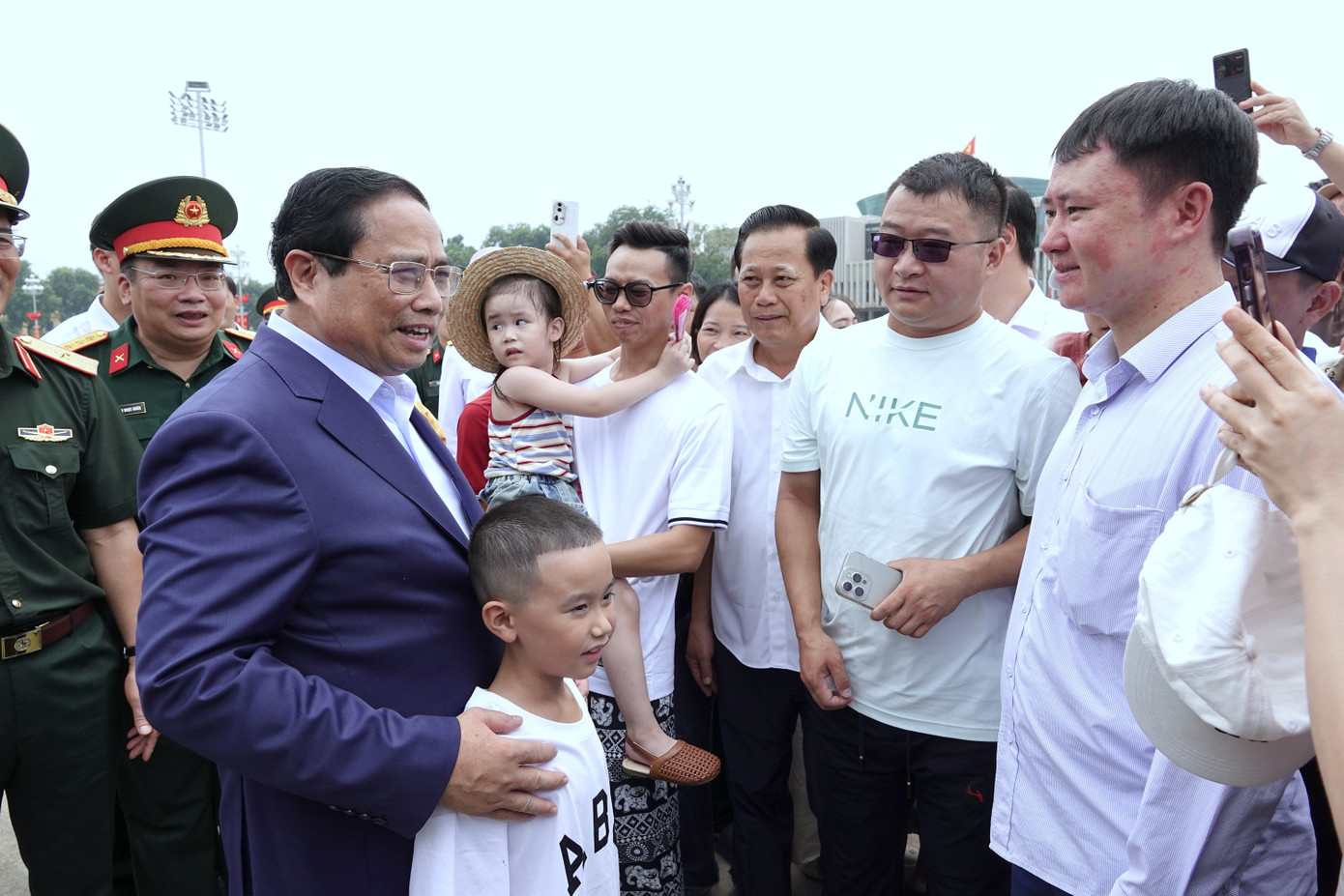 | Thủ tướng Phạm Minh Chính thăm hỏi, trò chuyện với người dân và du khách quốc tế tới tham quan Quảng trường Ba Đình, sáng 12/8. |