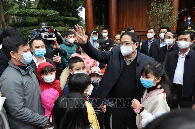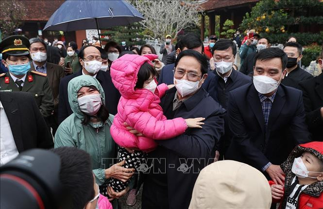 | Thủ tướng Phạm Minh Chính chụp ảnh chung cùng nhân dân đang du xuân đón tết tại Khu Di tích Kim Liên. |
