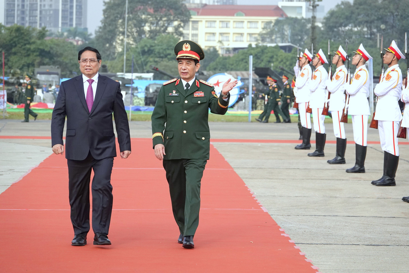 | Lãnh đạo Bộ Quốc phòng đón Thủ tướng Phạm Minh Chính tới dự khai mạc triển lãm. |