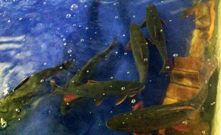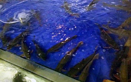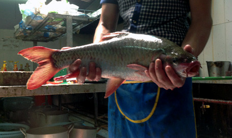Tại bể cá của nhà hàng, rất nhiều cá có hình thức giống hệt cá tại suối “cá thần” Cẩm Lương. Anh Đỗ Hoàng Việt, chủ quán, cho biết, đây là cá bỗng được đưa về từ vùng Tây Bắc. Loài cá này cũng chính là loài cá ở suối “cá thần” Cẩm Lương.
