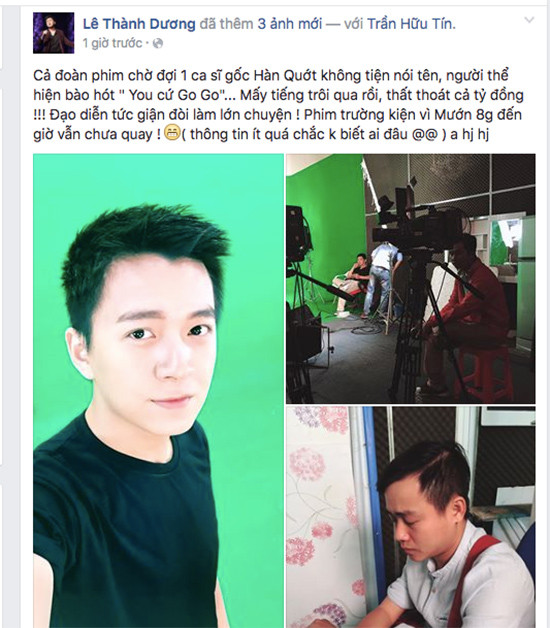 Anh viết:  “Cả đoàn phim chờ đợi 1 ca sĩ gốc Hàn Quốc không tiện nói tên, người thể hiện bài hót “You cứ Go Go”… Mấy tiếng trôi qua rồi, thất thoát cả tỉ đồng! Đạo diễn tức giận đòi làm lớn chuyện! Phim trường kiện vì mướn 8 giờ đến giờ vẫn chưa quay! Thông tin ít quá chắc không biết ai đâu”.