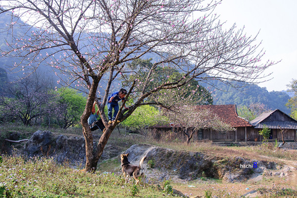 Những đứa trẻ nô đùa bên thân mận sắc thắm