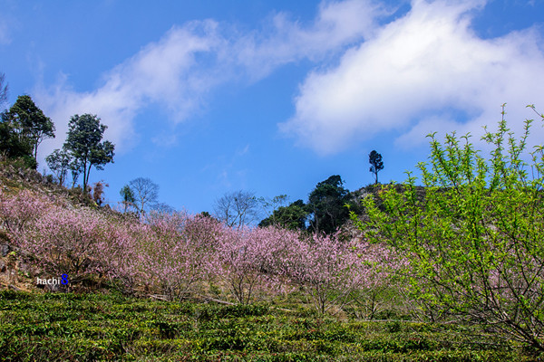 Hình ảnh hoa đào bên đồi chè, trời xanh mây trắng