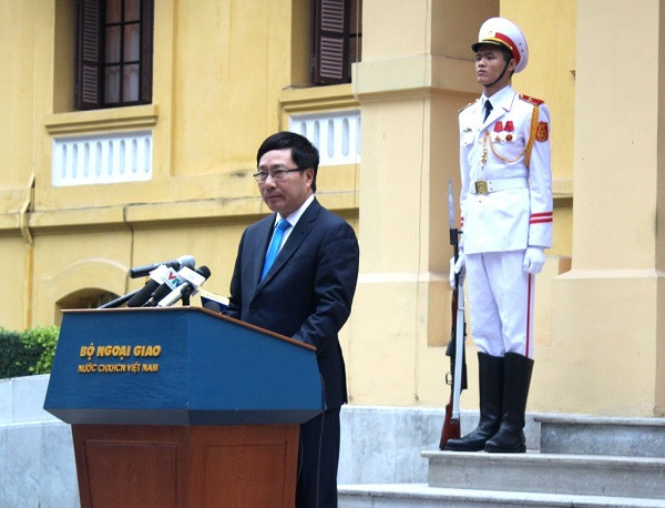 Phó Thủ tướng, Bộ trưởng Bộ Ngoại giao Phạm Bình Minh phát biểu tại Lễ Thượng cờ. Ảnh: Chi Hằng