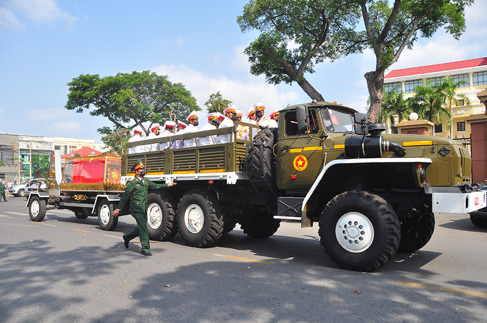 Xe chở linh cữu nguyên phó thủ tướng Trương Vĩnh Trọng rời Hội trường UBND tỉnh Bến Tre
