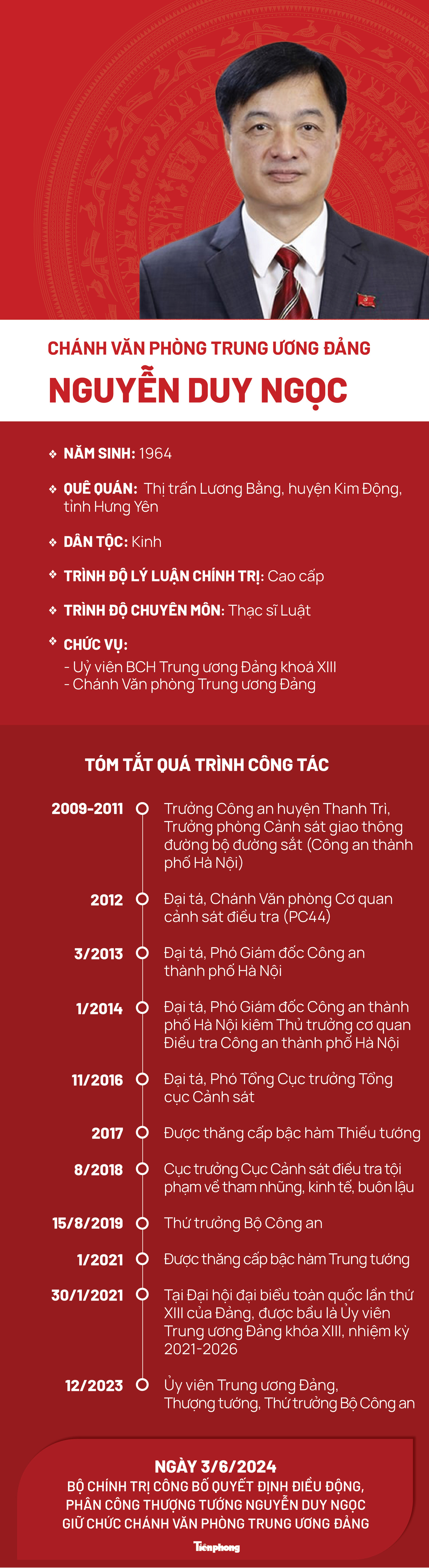 Sáng 3/6, Bộ Chính trị công bố quyết định điều động, phân công Thượng tướng Nguyễn Duy Ngọc - Ủy viên Trung ương Đảng, Thứ trưởng Bộ Công an, giữ chức Chánh Văn phòng Trung ương Đảng.