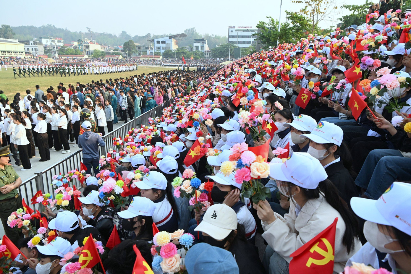 | Dù thời tiết nắng nóng, rất đông người dân Điện Biên đã tới sân vận động để theo dõi và cổ vũ các lực lượng tham gia hợp luyện. |