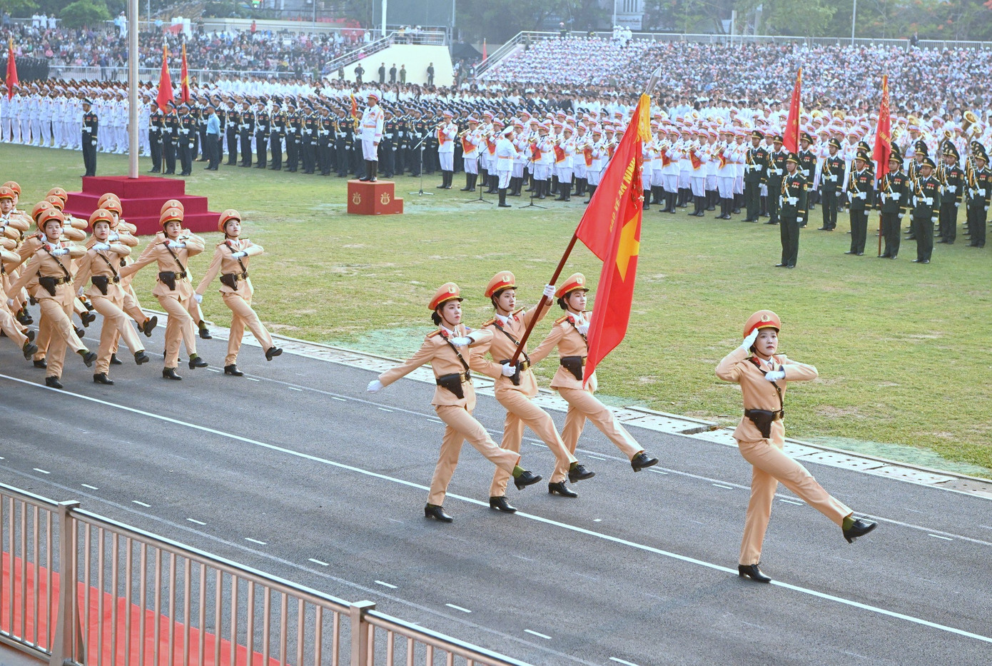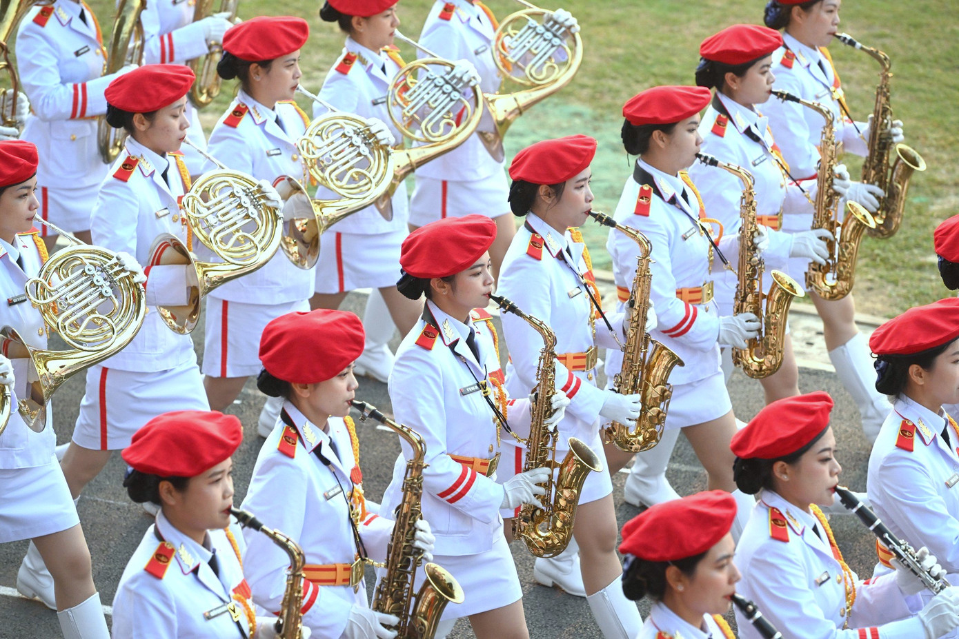 | Khối nữ quân nhạc với quân phục và nhạc cụ đặc trưng, đẹp mắt. |