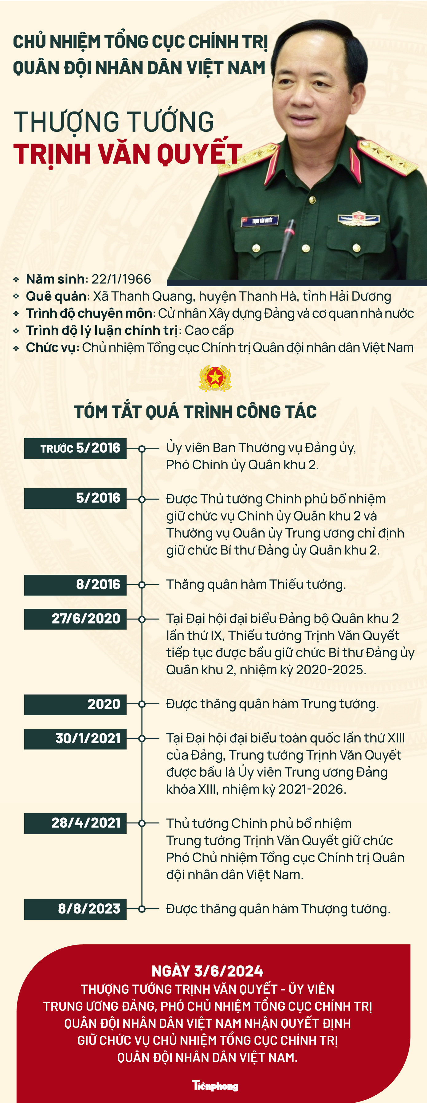 Thượng tướng Trịnh Văn Quyết sinh ngày 22/1/1966. Quê quán: xã Thanh Quang, huyện Thanh Hà, tỉnh Hải Dương. Trước tháng 5/2016, ông là Ủy viên Ban Thường vụ Đảng ủy, Phó Chính ủy Quân khu 2.