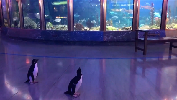 Vì không có khách qua lại, thủy cung cũng vắng vẻ nên ban quản lý nơi đây quyết định thả những chú chim cánh cụt thuộc giống Rockhopper ra để chúng đi thăm thú xung quanh.