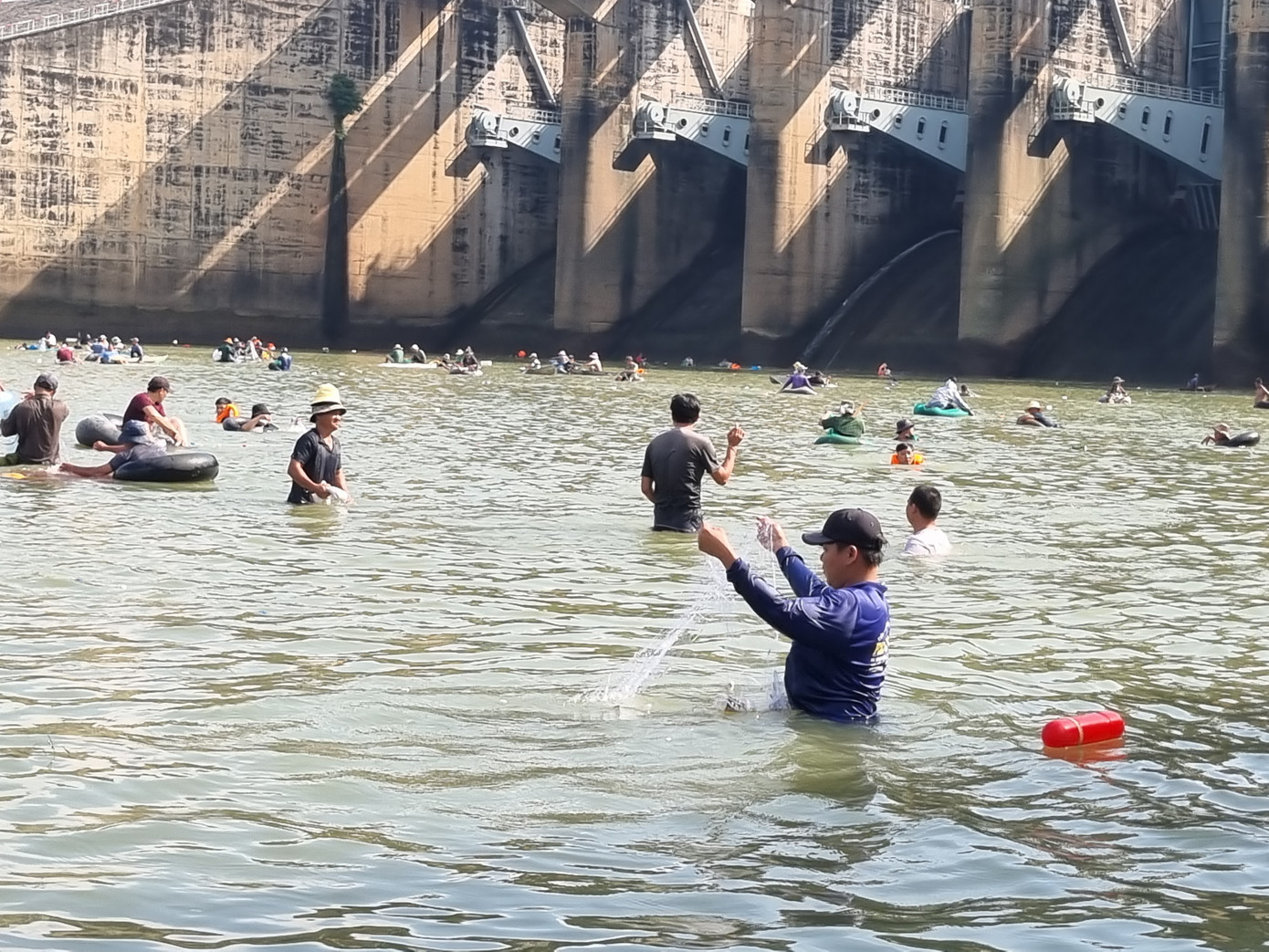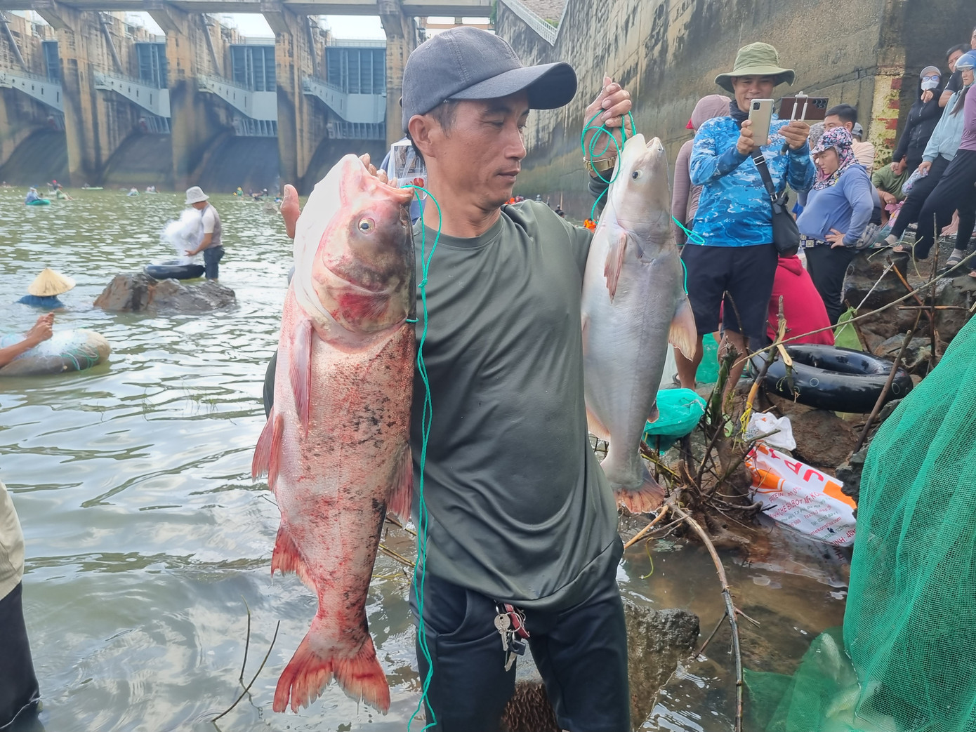 Trước thời điểm nhà máy đóng cửa xả tràn, hàng trăm người dân ở địa phương và nhiều nơi đã ngồi sẵn ở khu vực chân đập thủy điện để chuẩn bị bắt cá.