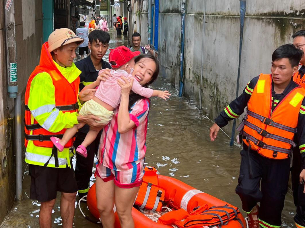 | Cán bộ chiến sĩ hỗ trợ người dân sống tại khu vực nước ngập sâu. |