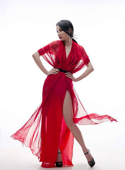 Người đẹp khoe đôi chân thon với chiếc đầm tay cánh dơi. Những nét xếp ly tạo vẻ mềm mại cho trang phục.