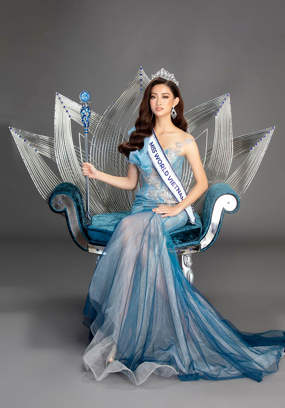Đặc biệt Tân hoa hậu Lương Thùy Linh còn xuất hiện bên quyền trượng và chiếc ghế đăng quang của mình - những vật phẩm uy quyền tượng trưng cho sứ mệnh quan trọng mà cô đang nắm giữ.
