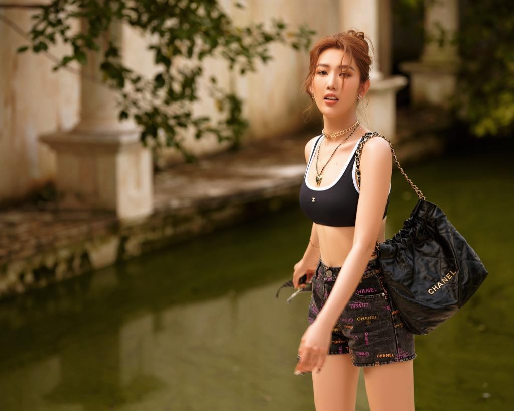 Thúy Ngân lựa chọn diện trang phục mang tông màu đơn giản, trung tính đi. Các phụ kiện như túi xách đeo vai, sandals đế bằng giúp các set đồ thêm phần nổi bật. Các mẫu thiết kế trong bộ ảnh đến từ nhà mốt Chanel, khắc họa hình mẫu một quý cô trẻ trung, năng động và hiện đại.