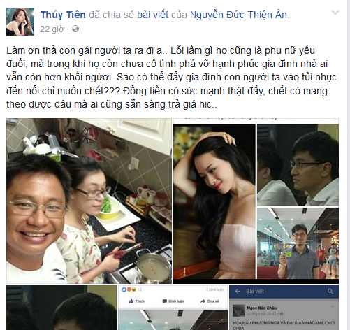Trên trang cá nhân của mình, nữ ca sĩ Thủy Tiên bày tỏ quan điểm của mình về vụ việc Hoa hậu Phương Nga bị khởi tố lừa đảo, chiếm đoạt tài sản 16,5 tỷ đồng của đại gia. Cô viết: “Làm ơn thả con gái người ta ra đi ạ. Lỗi lầm gì họ cũng là phụ nữ yếu đuối, mà trong khi họ còn chưa cố tình phá vỡ hạnh phúc gia đình nhà ai vẫn còn hơn khối người. Sao có thể đẩy gia đình con người ta vào tủi nhục đến nỗi chỉ muốn chết? Đồng tiền có sức mạnh thật đấy, chết có mang theo được đâu mà ai cũng sẵn sàng trả giá”.