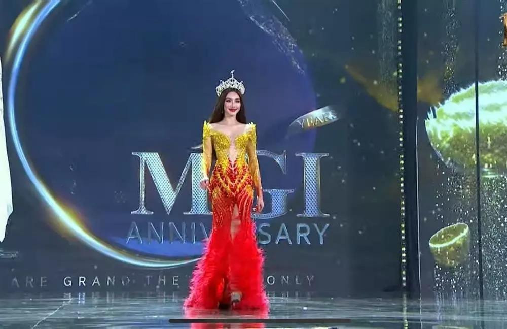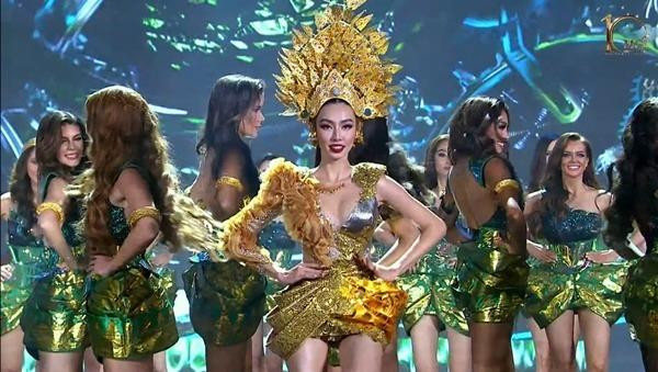 Trong khi các Hoa hậu khác đều diện váy áo ánh kim lấp lánh thì trang phục đỏ rực rỡ của Thùy Tiên biến cô thành đốm lửa chói sáng trên sân khấu, ai cũng phải nhận ra 'nàng Hậu' đầu tiên.