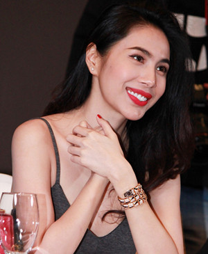 Ngồi trên ghế casting trong vai trò nhà sản xuất, nữ ca sĩ nổi bật chiếc đồng hồ hình rắn đính vàng và kim cương trị giá 2,7 tỷ đồng, đôi giày và chiếc ví tay trị giá khoảng 300 triệu đồng.
