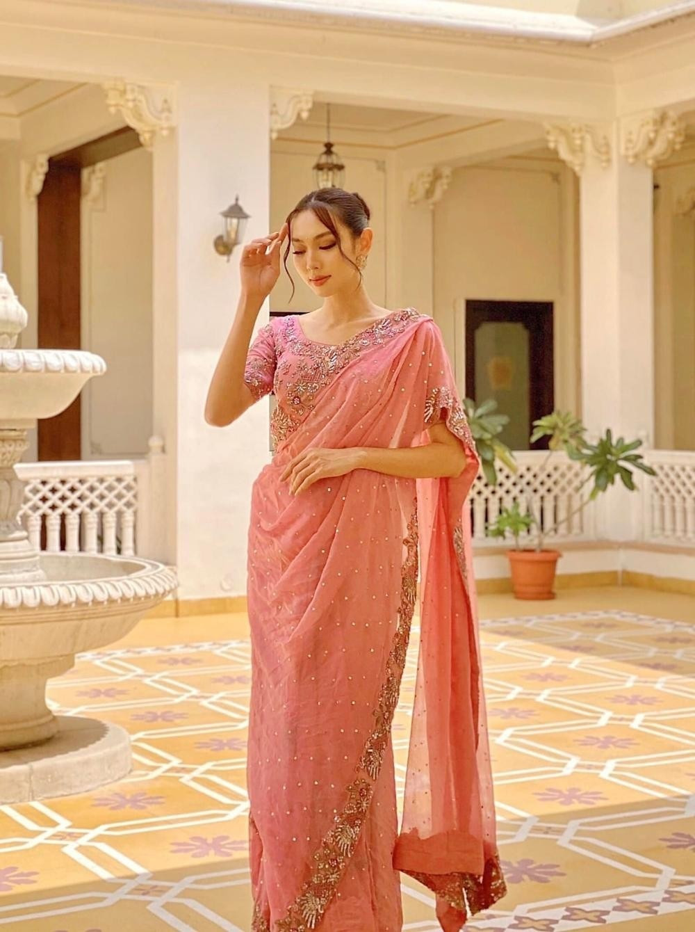 Thùy Tiên mặc saree màu hồng, xinh đẹp như một cô gái Ấn Độ.