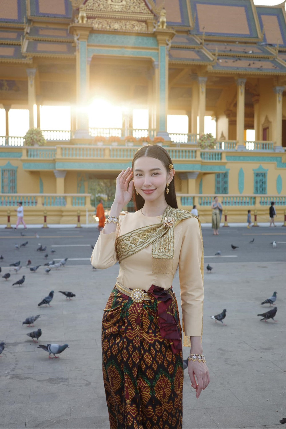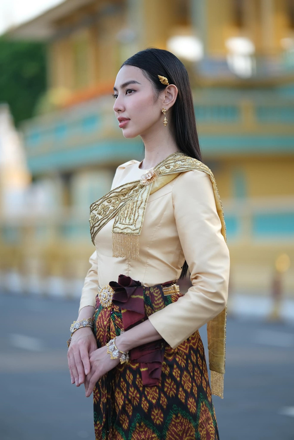 Mới đây, Hoa hậu Thùy Tiên đã tự hào khoe trên trang cá nhân loạt ảnh: “Lần đầu tiên mặc trang phục truyền thống của Campuchia ạ!”.