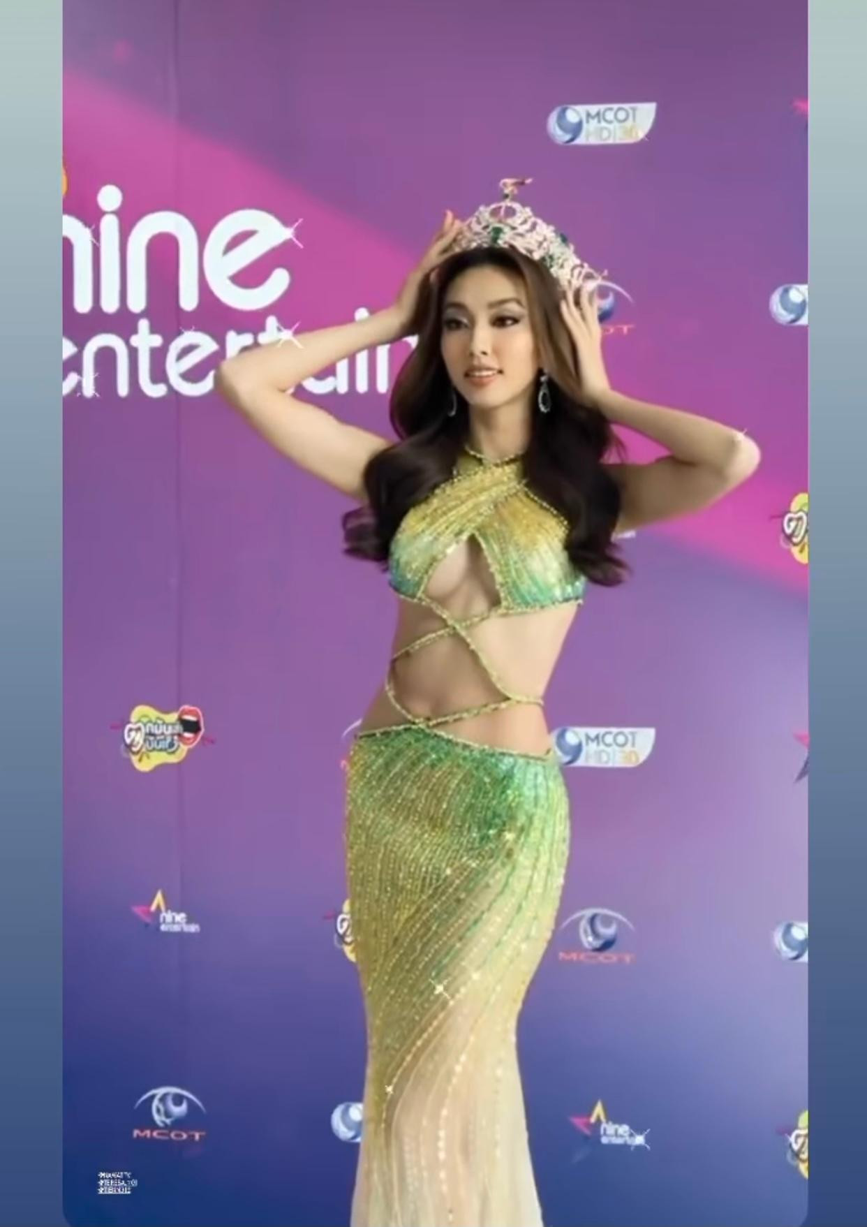 Diện lại bộ váy dạ hội 'định mệnh' từng giúp mình chiến thắng trong đêm chung kết Miss Grand, Thuỳ Tiên khoe trọn đường cong nóng bỏng trước ống kính của phóng viên Thái Lan.