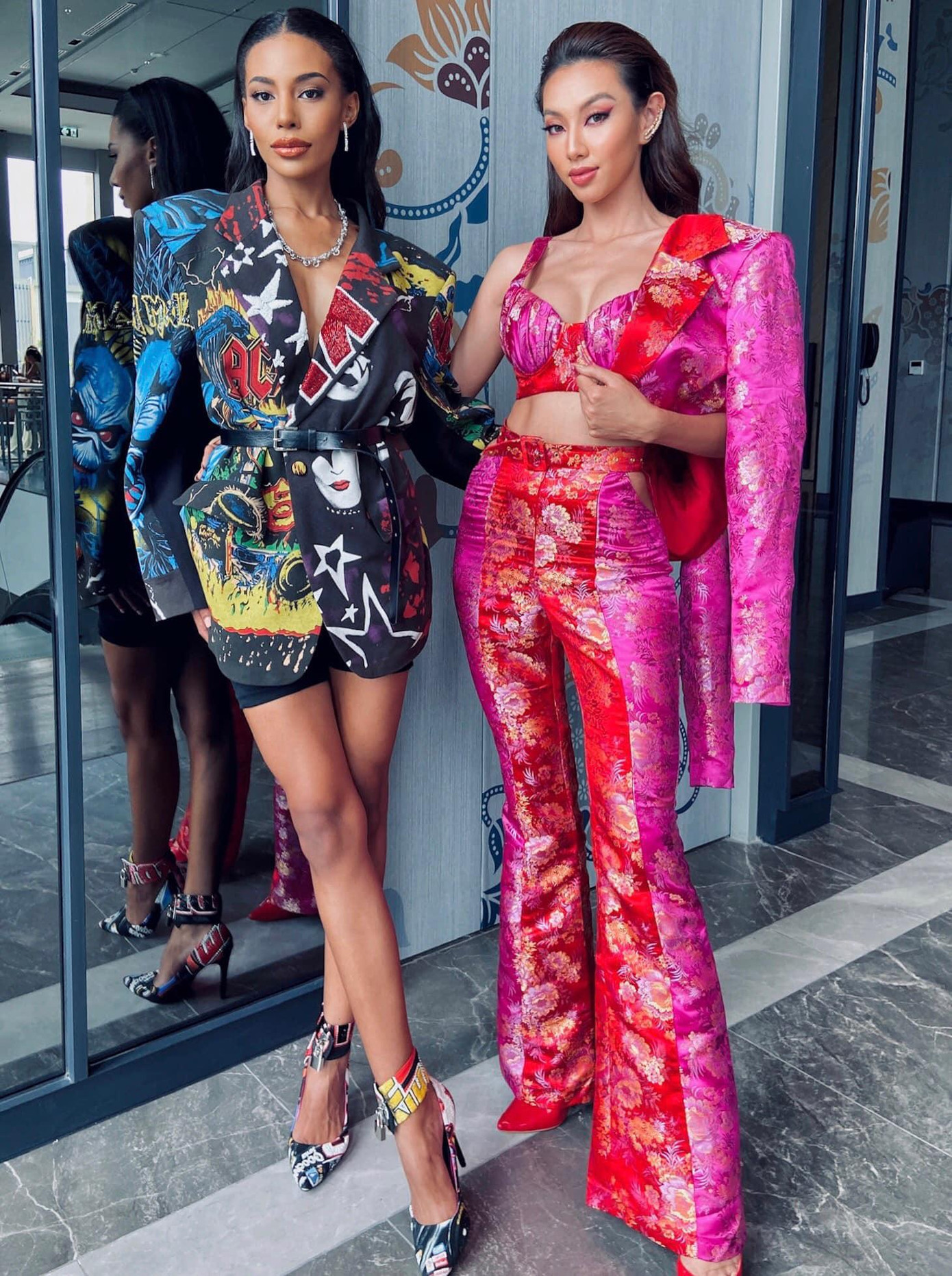 | Thuỳ Tiên và đại diện Thái Lan cùng chọn trang phục rực rỡ màu sắc và hoạ tiết cho phần thi phỏng vấn kín. |